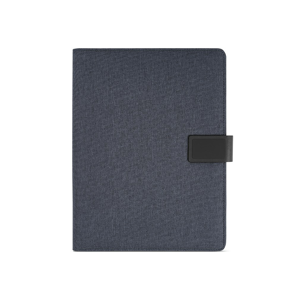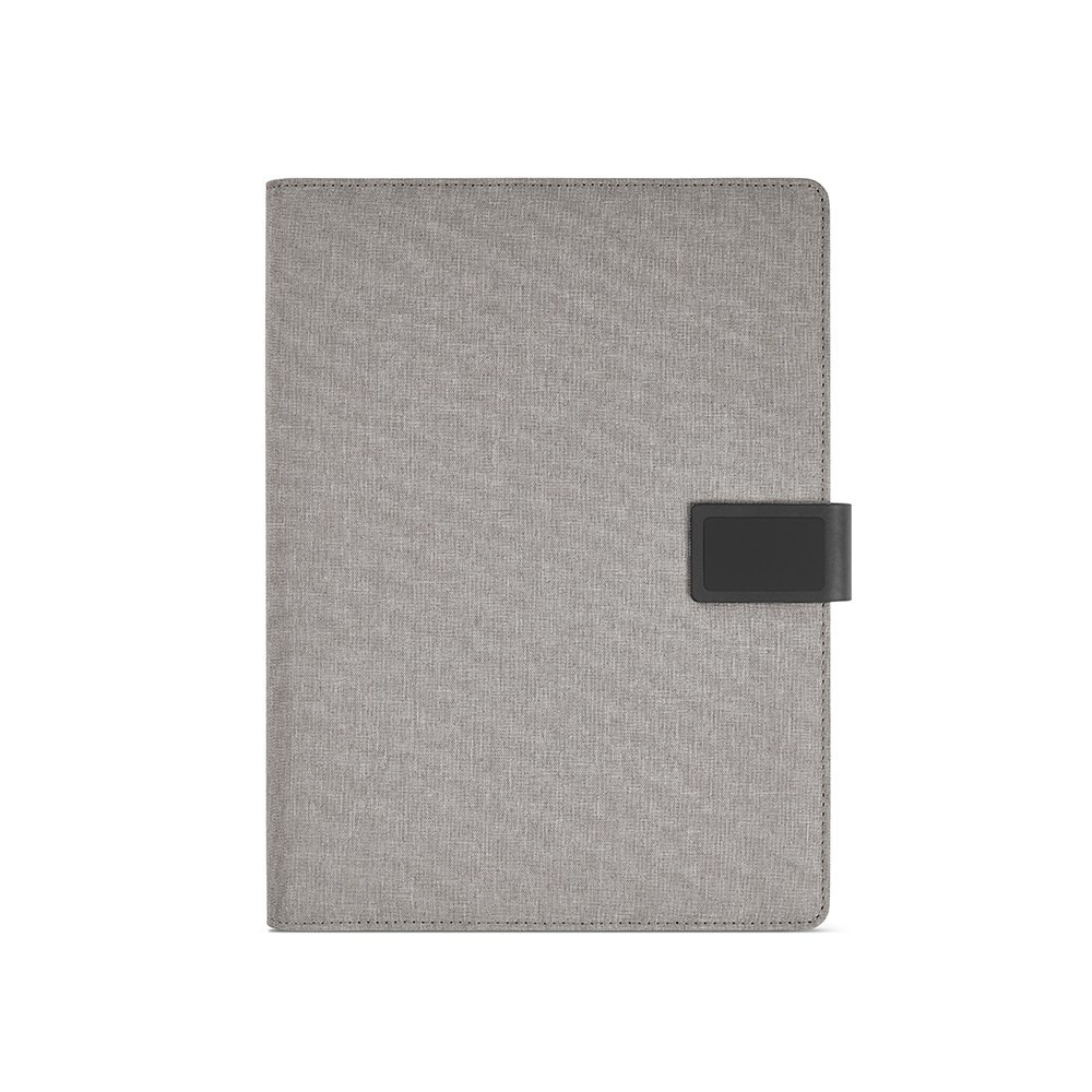 The Tolstoy A4 300D rPET folder with magnetic rPU closure. It will hold a tablet (up to 29 x 18 cm), a 64-sheet FSC ivory dotted paper pad (70 gsm), pages with dedicated area for date and page number, a phone (up to 10 x 18 cm), 2 cards and a pen. All packed in an individual recycled kraft box.