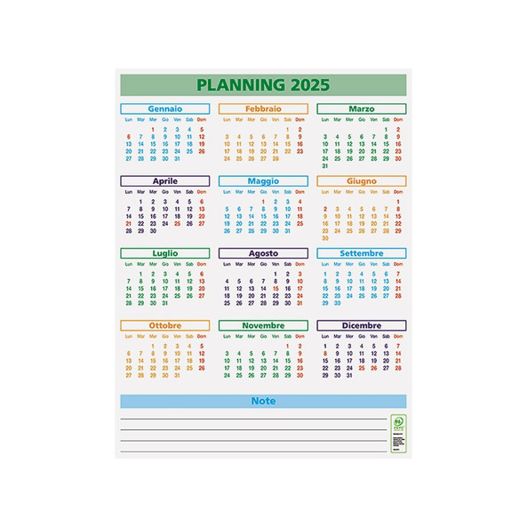 Monthly calendar 12 sheets of 70 gr coated paper with heat-sealed header, international holidays and notes page printed on the back. Expense memo on the last page
