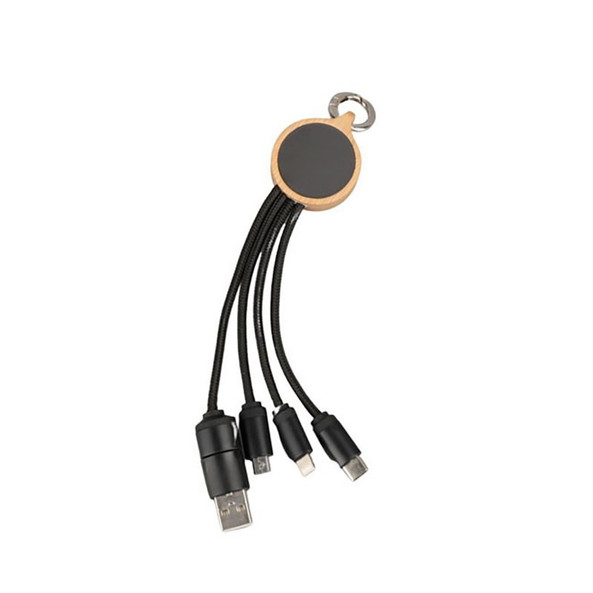 Charging cable with keychain, with bamboo insert. Backlit to illuminate your logo after engraving. USB and type-c input. Micro USB, lightning, and type-c output. Cables coated in polyester.