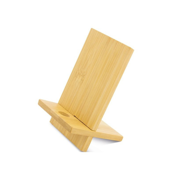 Support made of bamboo from natural cuts. Very easy to assemble, with a slot for charging the device while it is placed onto the base