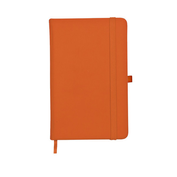 Notepad with soft-touch covers, in PU leather and in bold colors. 100 blank sheets, with elastic band and matching color fabric bookmark.