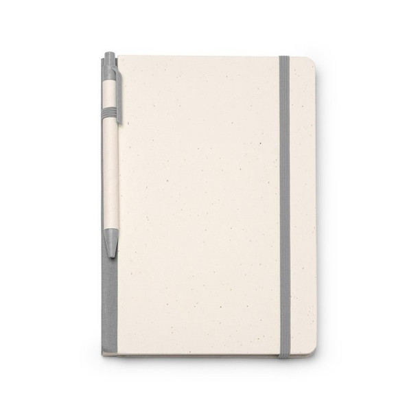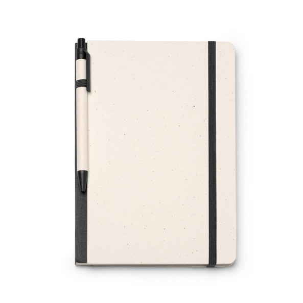 A5 notebook made from recycled milk cartons. Hardcover with fabric insert, with pen loop on the left edge. Colored elastic closure. 80 blank pages. Includes a ballpoint pen made from recycled milk cartons, with colored details matching the notebook inserts. Blue ink.