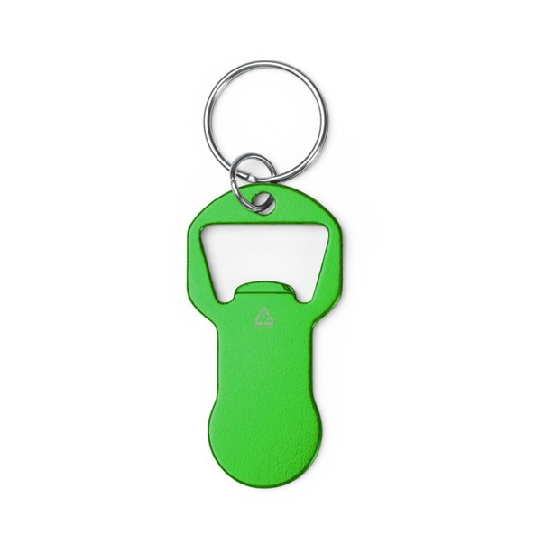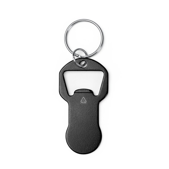 Keychain bottle opener made of recycled aluminum, with integrated coin for the shopping cart. Large customization area.