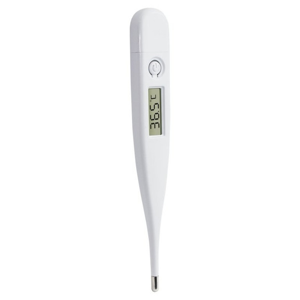 Digital thermometer. When the temperature measurement is completed, the thermometer emits an acoustic signal indicating it. Measurement in both Celsius and Fahrenheit. It has a 3-digit LCD screen with memory to retrieve the last measurement taken. It can be used in different hot spots: groin, armpits, and mouth.