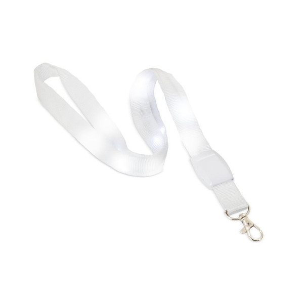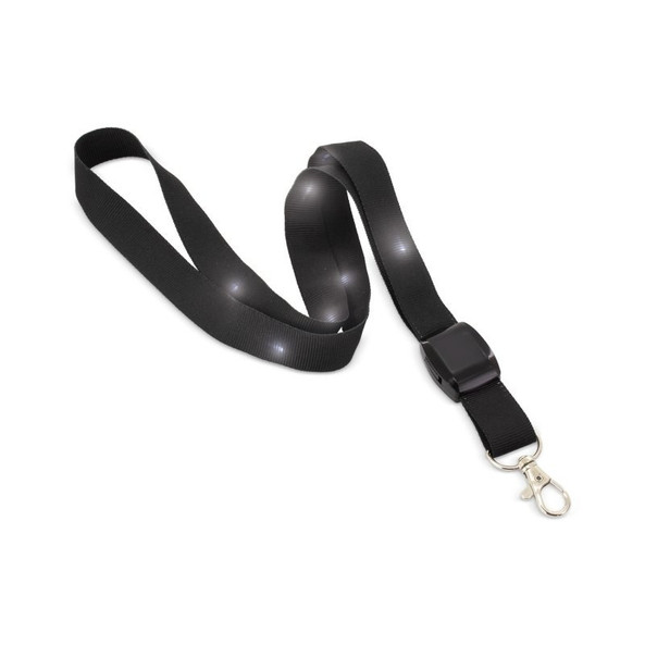Polyester lanyard with built-in LED lights. 3 light modes. Equipped with power on/off button. Batteries included.