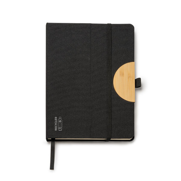 A5 hardcover notebook in RPET with stand function for mobile devices. Elastic closure, page marker and pen loop. 80 smooth cream colored sheets.