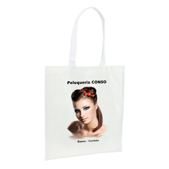 White shopping bag in 80 g/m2 TNT, particularly suitable for sublimation. Long handles of 60cm. Sewn finishes.