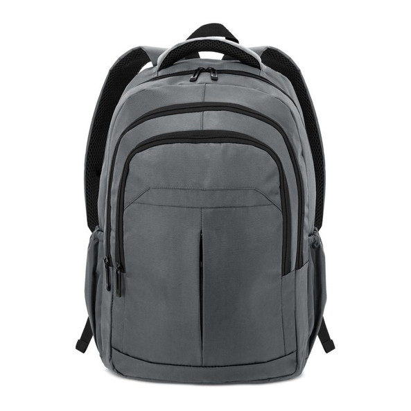 Computer backpack made of polyester. Large main compartment with padded laptop pocket suitable for laptops up to 17". Two zippered compartments. Front zip pocket. Elastic side pockets. Padded back panel. Adjustable padded shoulder straps.