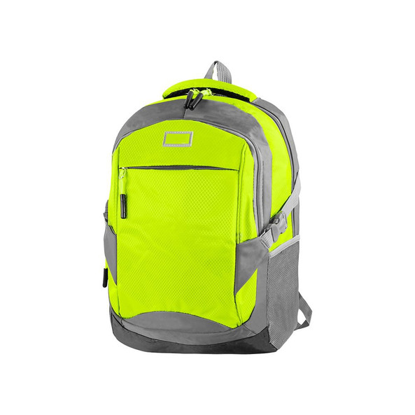 Backpack with 2 main zippered compartment. Inside padded compartment for laptop. Buckle closure at sides. Zippered front pocket. Sides lateral elastic mesh pockets. Padded handle. Adjustable straps.