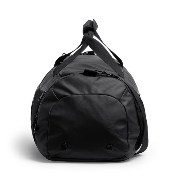 Multi-function PU leather duffle bag/backpack with premium finish, water-resistant. Large main compartment with zip closure, padded internal pocket for laptop. Multiple external pockets and shoe compartment. All compartments feature waterproof zippers. Padded shoulder strap with option to use the duffle bag as a backpack.