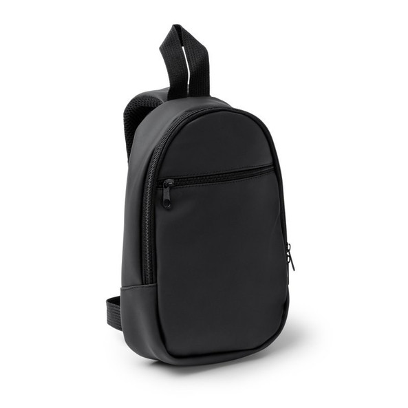 Single-shoulder backpack made of PU. Large main compartment with zip closure and two internal pockets. Front zip pocket. Padded shoulder strap.