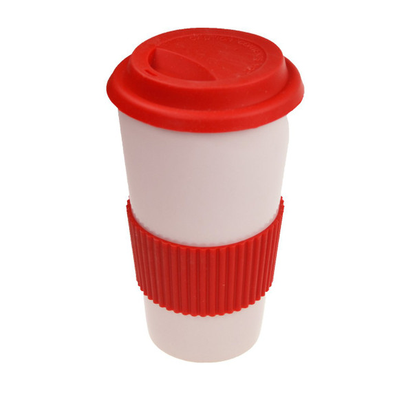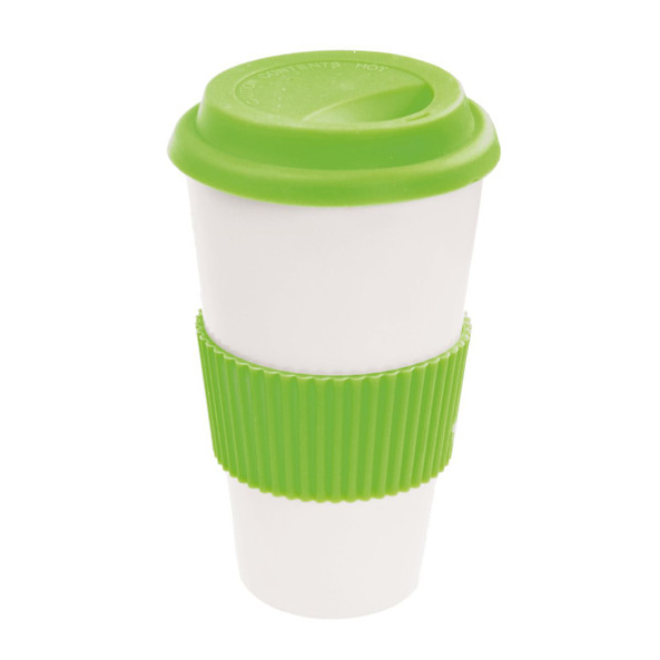 Single-wall tumbler with press-on lid and silicone grip. 450ml