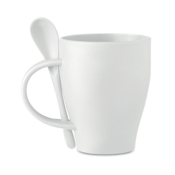 Reusable cup with spoon. Enjoy your coffee, tea or hot chocolate in this mug with a simple yet classic design suitable for everyday use. This mug comes with a useful spoon that you can store in the handle. Capacity 300ml.