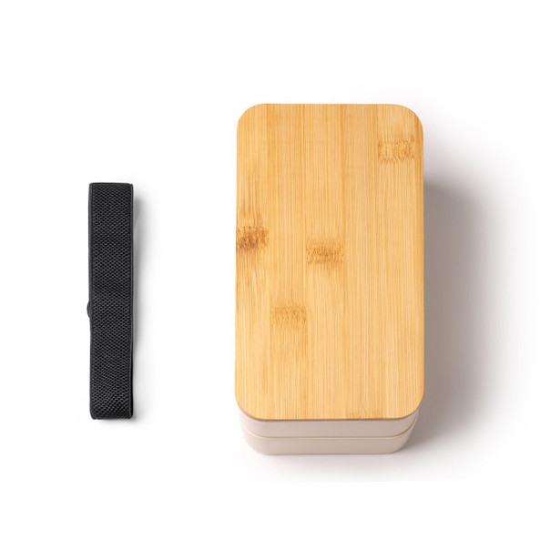 PP lunch box with two compartments, with a bamboo lid. Includes cutlery set, removable divider, and elastic closure band. Capacity 800ml.