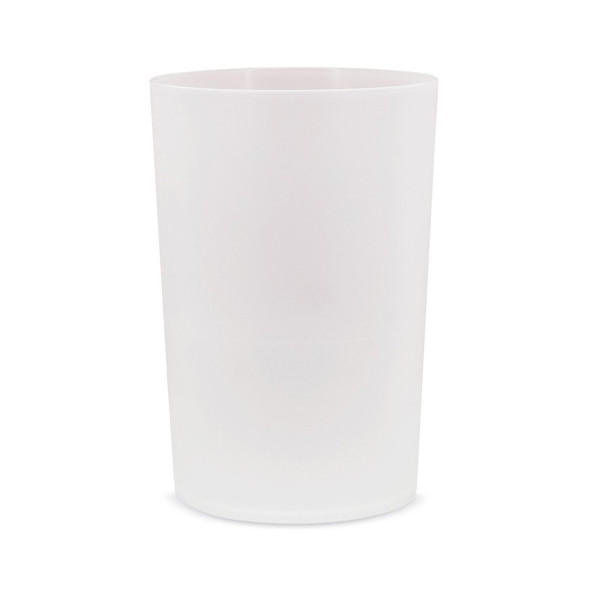 Translucent cup in PP, 430ml capacity, reusable.