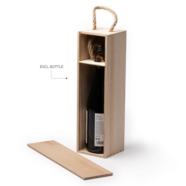 Bottle holder wooden box, with practical handle for transport. Slide closure. It can hold a bottle.
