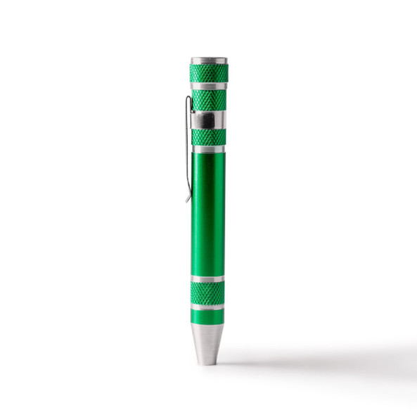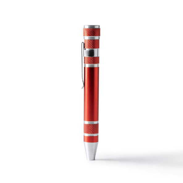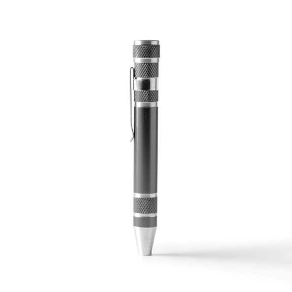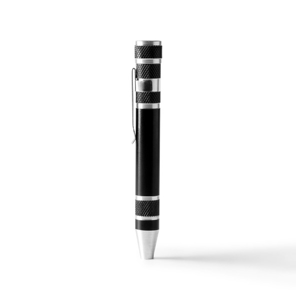 Pen-shaped aluminum multipurpose tool. 8 screwdriver heads, star and flat, included.