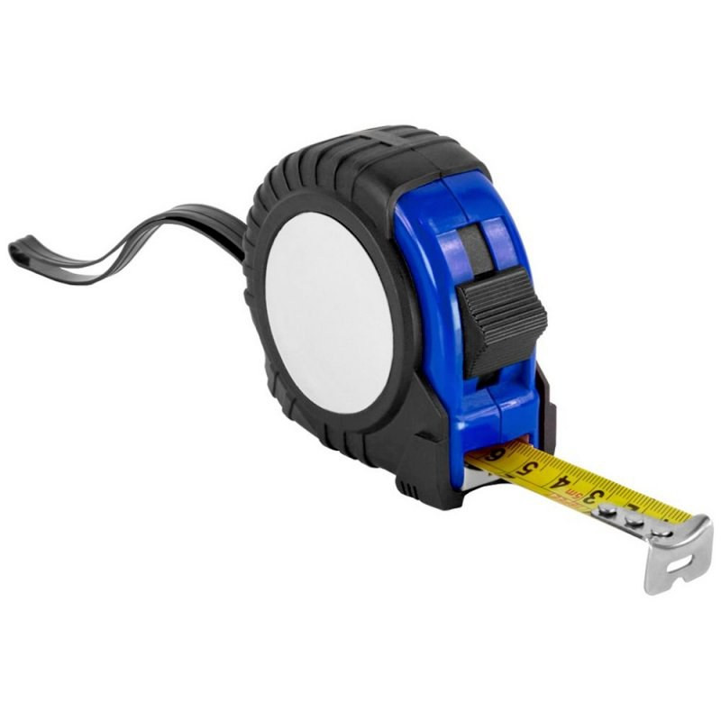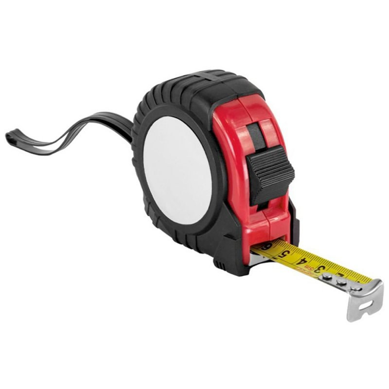Approved 5 m. flexometer with blocking mechanism and metallic strip hook. Body in colour rubber, metallic clip and carry strap. Presentation in individual box.