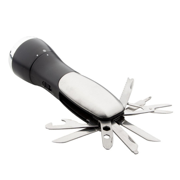 Multi-tool with resistant non-slip finish in metallic color. With 12 functions and built-in 4 LED flashlight. Includes screwdriver heads, knives, keys, scissors and openers. Presented in an individual box. Battery 1xAAA not included.