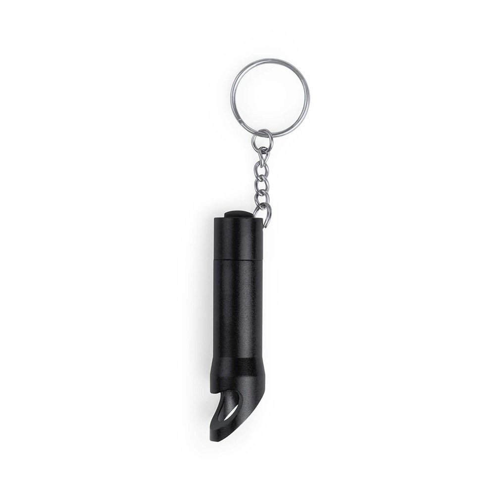 3 LED keychain flashlight with high lighting power and built-in bottle opener. With a resistant aluminum body in varied bright tones and ON/OFF button protected with a resistant rubber coating. Button cell batteries included with protective film.