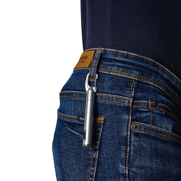 Ball pen with LED flashlight, available in different metal finish colours and push button in black. In-built carabiner in cap. Blue ink refill.