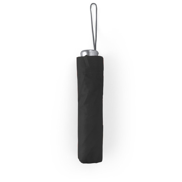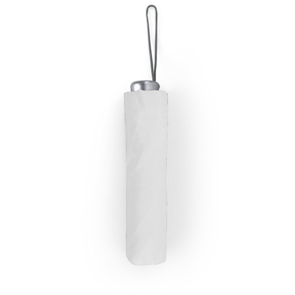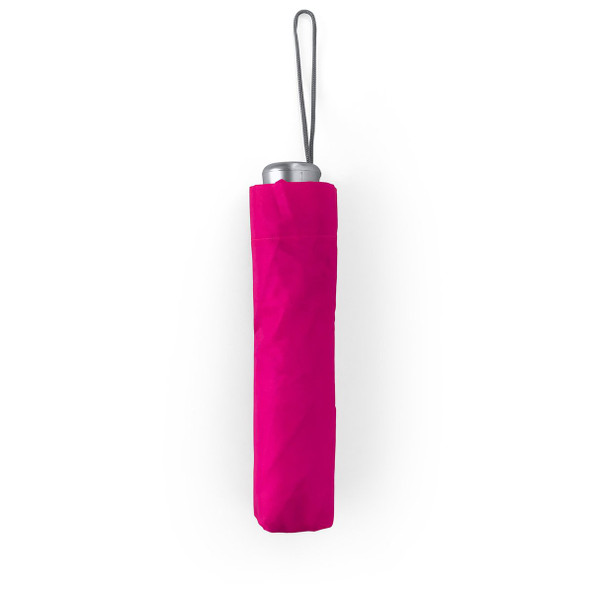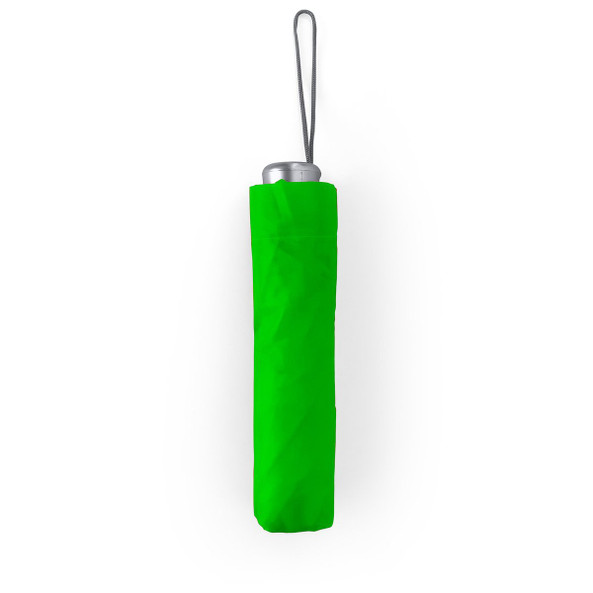 Folding umbrella of 8 polyester 170T panels in a wide range of bright tones and 96cm in diameter. Manual opening, with silver colored metal ribs, velcro closure and ergonomically shaped carrying strap. Presented in a matching color individual case.