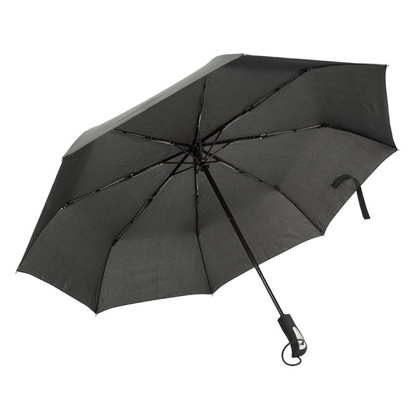 3 section foldable umbrella. Automatic opening and closing, wind proof. Fiberglass shaft and metal ribs. Rubber handle with elastic. Supplied with pouch.