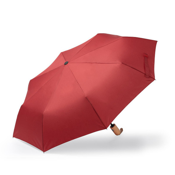 Foldable umbrella with automatic opening and closing. 190T pongee fabric. Windproof. Coordinated pouch. Bamboo handle with cotton strap. Provided in an eco-designed packaging.