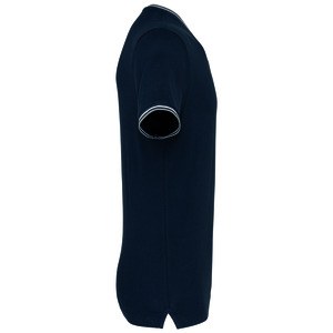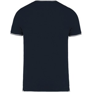 Men's piqué knit V-neck T-shirt in combed cotton for premium comfort and durability. This refined basic combines the classic V-neck silhouette with a textured piqué finish, offering a more sophisticated look than standard jersey tees. The 100% combed cotton construction ensures a soft touch against the skin while maintaining structural integrity over time. Design details include rib finishing with contrasting stripes at the neck and cuffs, adding a subtle athletic touch. The taped neck and side slits provide extra comfort and freedom of movement, while the twin needle finishing at the hem ensures long-lasting wear. For B2B clients, this shirt is an excellent canvas for customization. The textured piqué surface is particularly suited for high-quality embroidery, making it a top choice for corporate uniforms, hospitality staff, or premium promotional merchandise. For B2C shoppers, it serves as a stylish, versatile piece for casual outfits. Whether worn blank as a minimalist staple or customized with a logo, this T-shirt delivers on both style and functionality. Available for bulk purchase with competitive wholesale pricing.