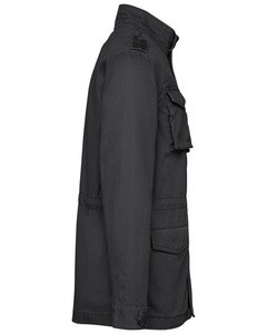 Zip fastening with metal slider and main fabric pull tab, as well as a button placket with invisible press studs at centre front.