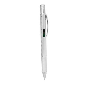 Multifunction ball pen with the following tools: level, ruler in centimeters and inches, flat screwdriver and star screwdriver.