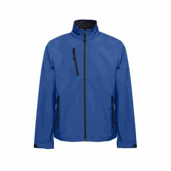 96% polyester and 4% elastane (280 g/m²) softshell jacket (unisex) with two layers and water-resistant coating. Fleece lined jacket with 2 front pockets and diagonal chest pocket, both zippers with rubber pullers. Adjustable cuffs with self-adhesive hook and loop fastener and drawstring at the hem